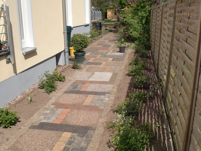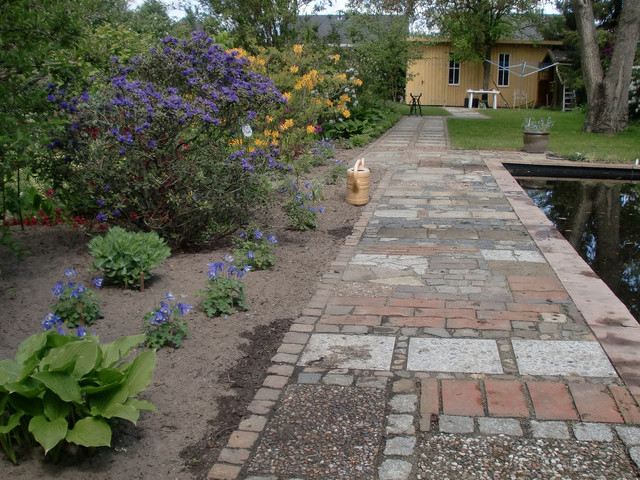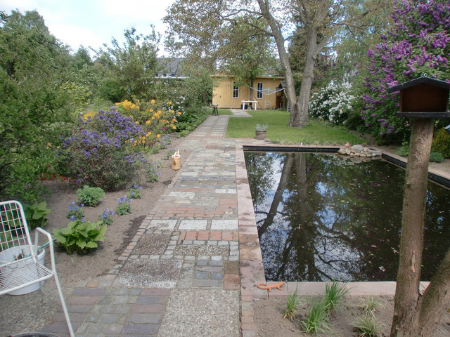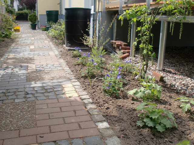 In diesem Garten wurden alte und neue Materialien in der Wegegestaltung kombiniert, wodurch ein klassisches Patchwork-Muster entstanden ist. Die strukturierten und gradlinigen Formen der einzelnen Gestaltungselemente fügen sich harmonisch in das schmale, langgezogene Grundstück ein.