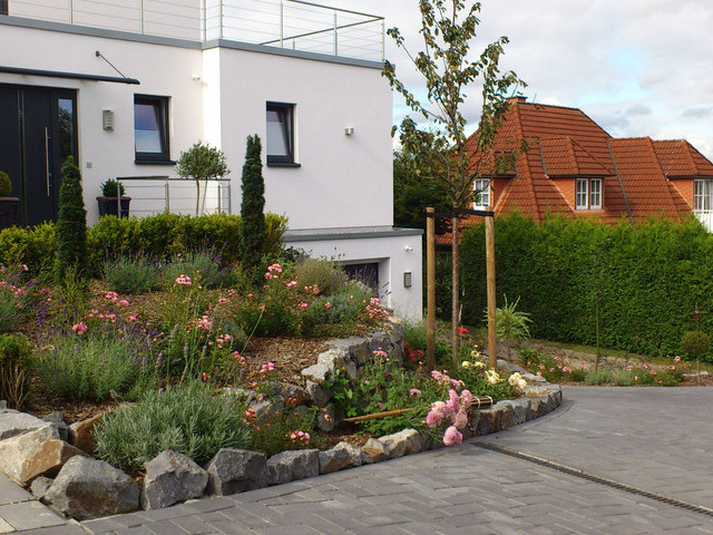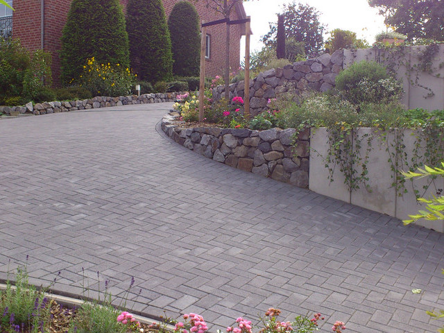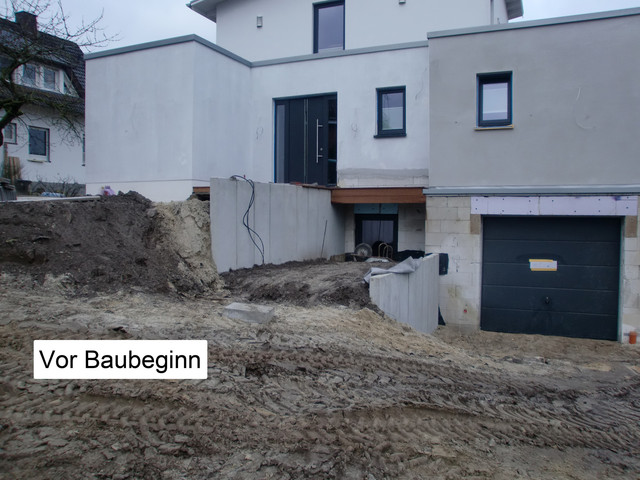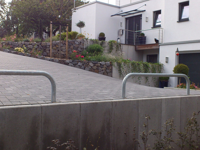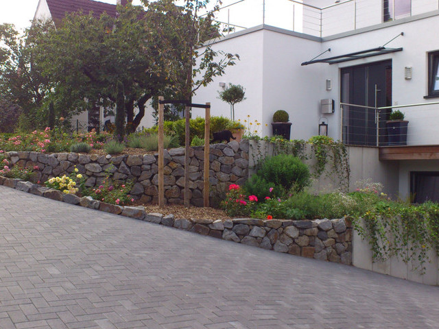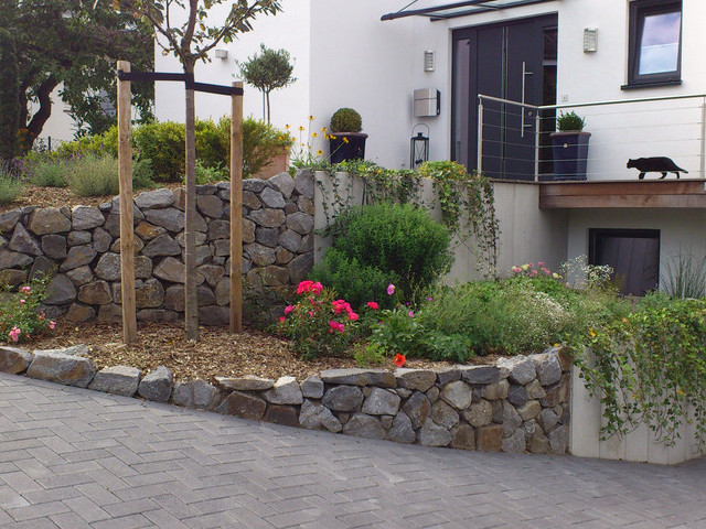 Die verschiedenen Höhen des Grundstücks werden mithilfe von Trockenmauern und Betonelementen abgefangen. Zum Kaschieren der stützenden Betonelemente wurde Efeu gepflanzt, der die Betonwände verdecken soll. Die Materialien für die Trockenmauern und Wegebeläge sind farblich auf das Haus abgestimmt.